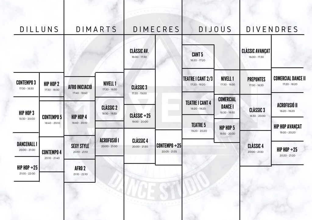 Iniciació a la Dansa – Clàssic – Prepuntes – Royal – Contemporani – Hiphop – Dancehall – Afrobeat – Sexystyle – Comercial Dance – Teatre i cant – Acrofusió